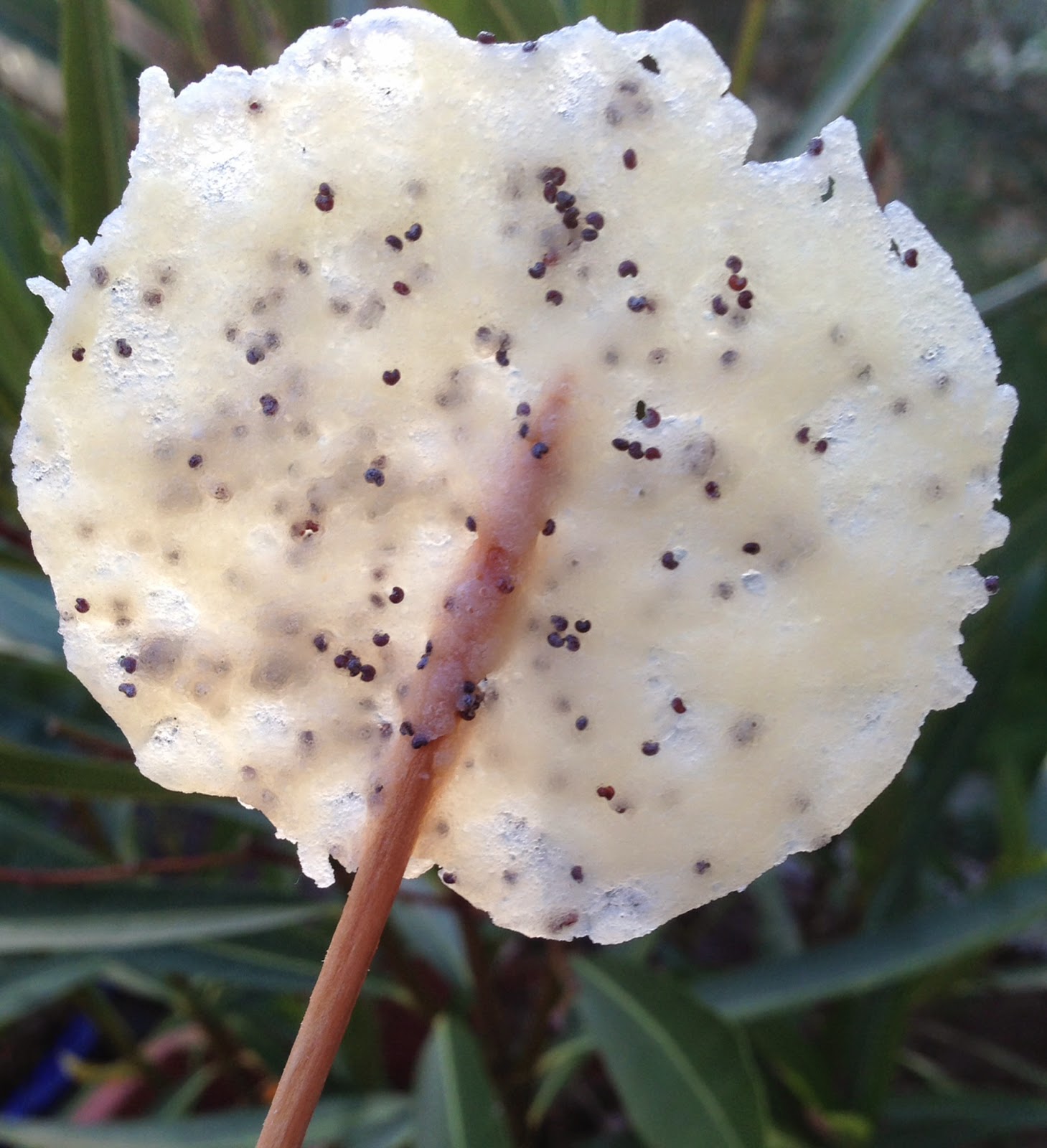 Plongez les brochettes environ 10 mn dans l’eau froide. Râpez le parmesan. Mélangez-le avec les graines de pavots et la cuillère à café de maïzena. Sur une plaque à pâtisserie mettez une feuille de papier sulfurisé. Déposez des cuillérées de parmesan et formez des ronds de 6 cm de diamètre, sur 2 mm d’épaisseur. Déposez une brochette au centre. Enfournez jusqu’à ce que le fromage fonde et forme des bulles. Sortez la plaque du four et laissez refroidir. Décollez délicatement les sucettes